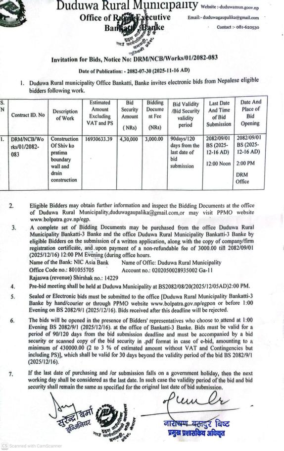 शिवको प्रतिमा बाउन्ड्री वाल र नाली निर्माण सम्बन्धि बोलपत्र आव्हानको सूचना !!!